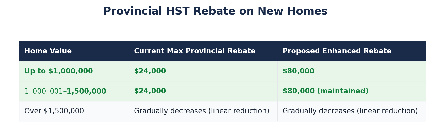 The budget also proposes to eliminate the provincial HST New Housing Rebate and the New Residential Rental Property Rebate after the enhancement period ends, with further transitional details to be set out later.