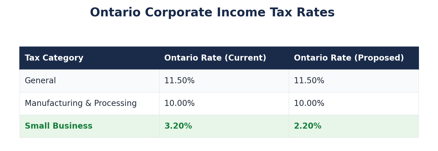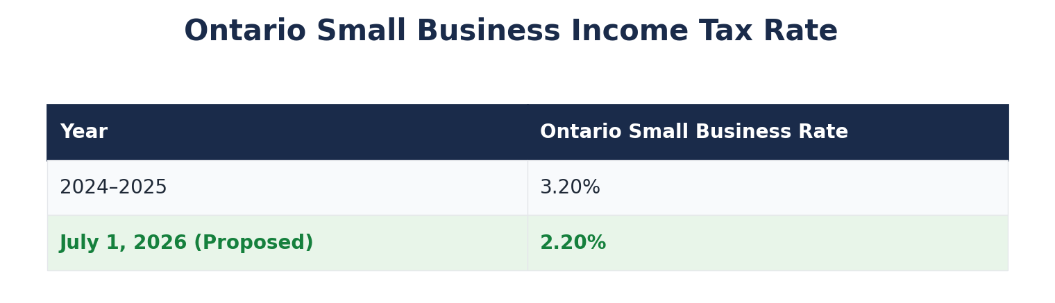 For a small business earning $500,000 in eligible income, that could mean savings of up to $5,000 per year. Because the change takes effect mid-year, the rate would be prorated for taxation years that straddle July 1, 2026.