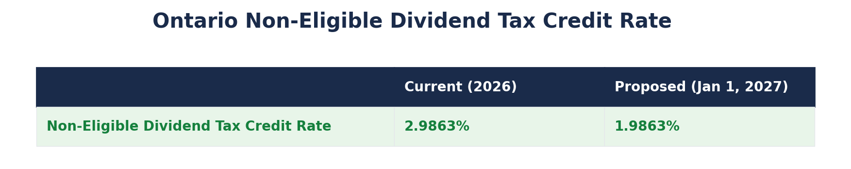 If you receive non-eligible dividends, or if you own a corporation and pay yourself dividends, there is another change to note. Ontario is proposing to reduce the non-eligible dividend tax credit rate from 2.9863% to 1.9863%, effective January 1, 2027.